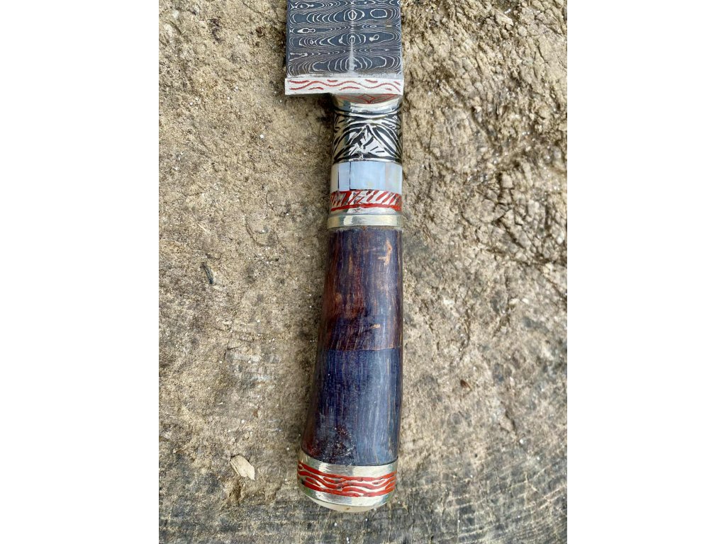 Rukojeť je vyrobena z kombinace přírodního dřeva, kovových zdobných kroužků a tradičních detailů, perleťová inkrustace . Perfektně sedí v ruce a celému noži dodává elegantní orientální vzhled.