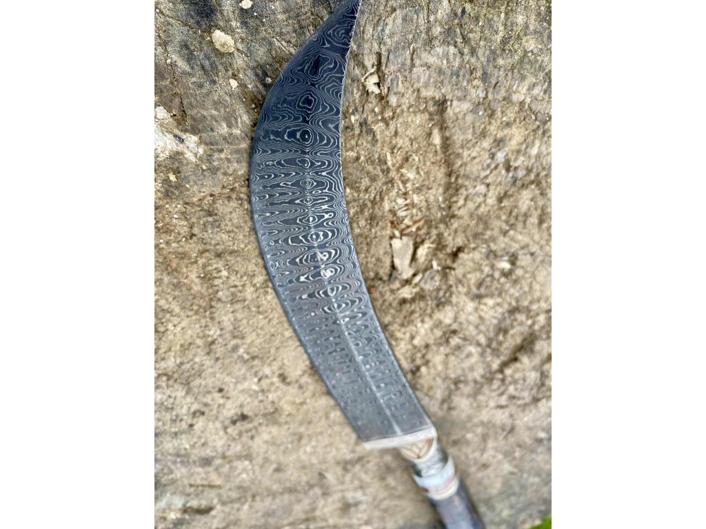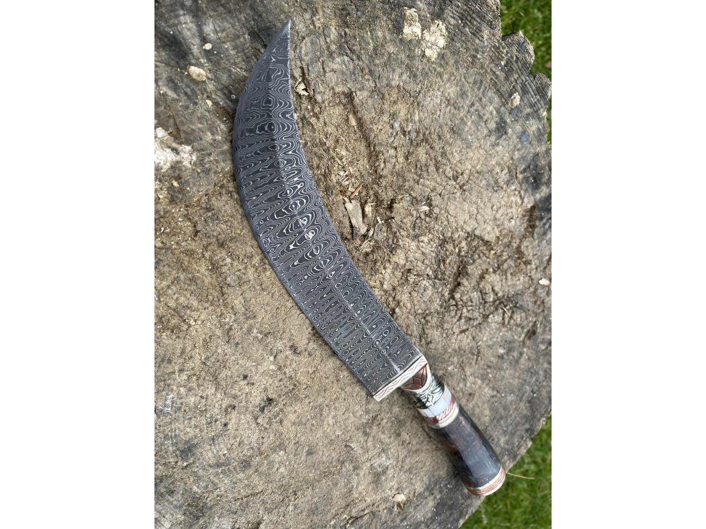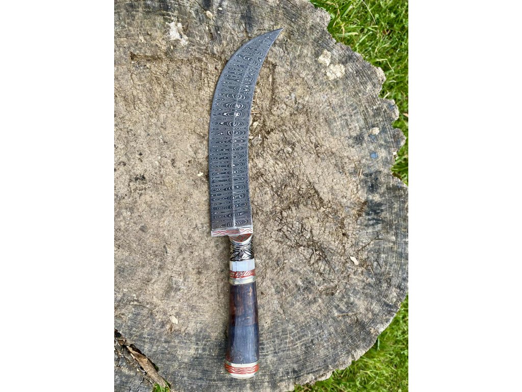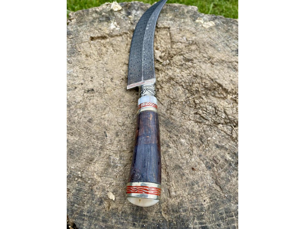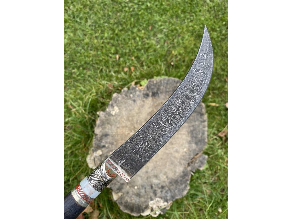 Luxusní ručně vyráběný uzbecký nůž Pčak z damascénské oceli. Tradiční křivá čepel, omamně krásná kresba damašku a zdobená rukojeť z přírodních materiálů. Každý kus je originál – ideální do sbírky, na cesty i jako výjimečný dar.