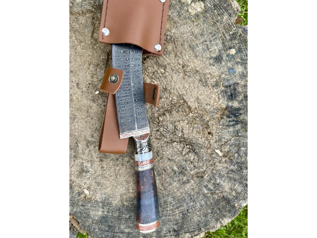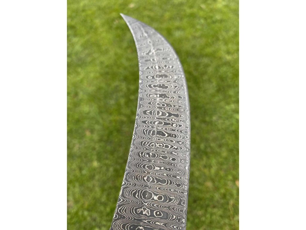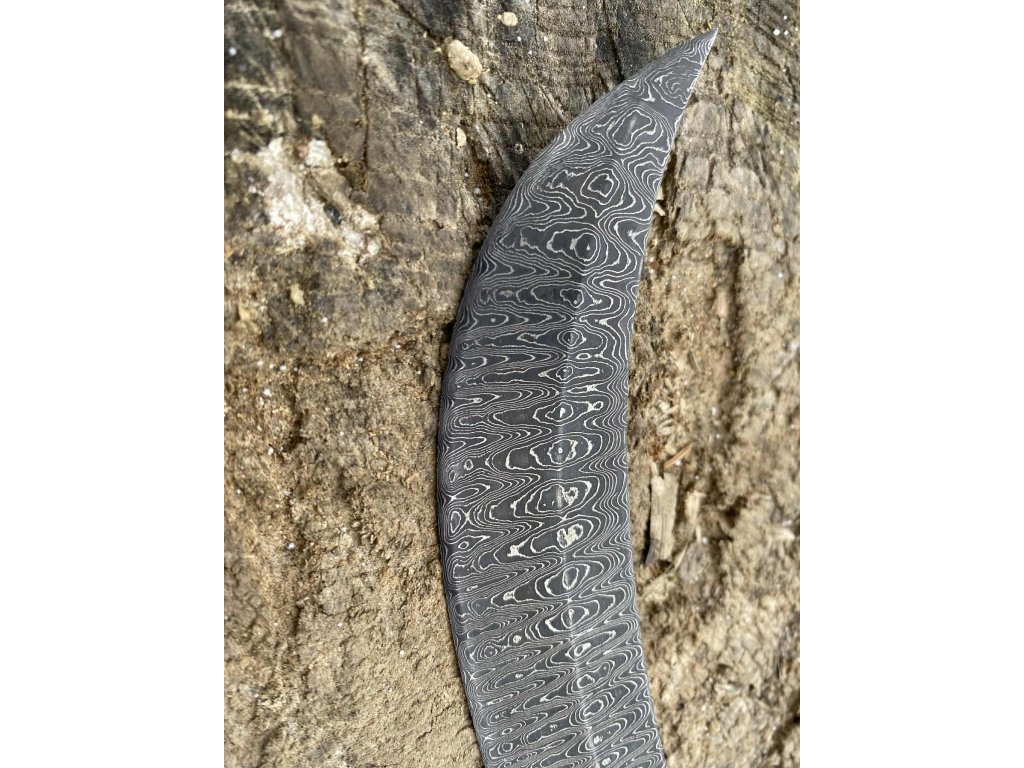 Tento jedinečný kus je vyroben z damascénské oceli, jejíž charakteristická kresba vytváří nádherný mozaikový vzor po celé délce čepele. Každý vzor je nepřehlédnutelný, každý milimetr ručně kovaný – žádné dva nože na světě nejsou stejné.